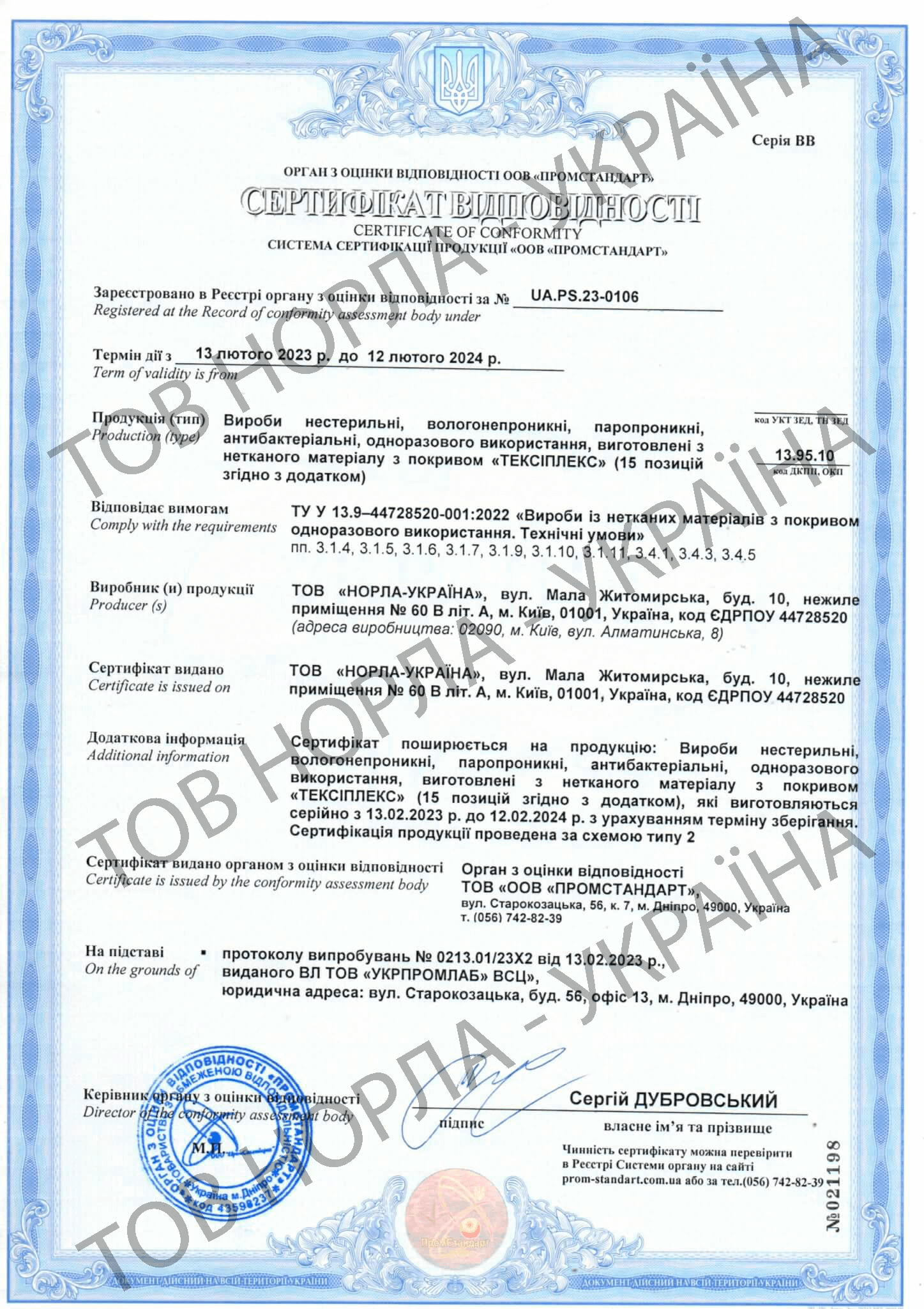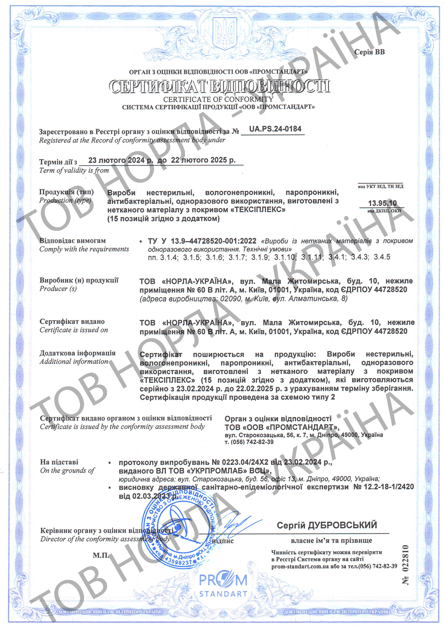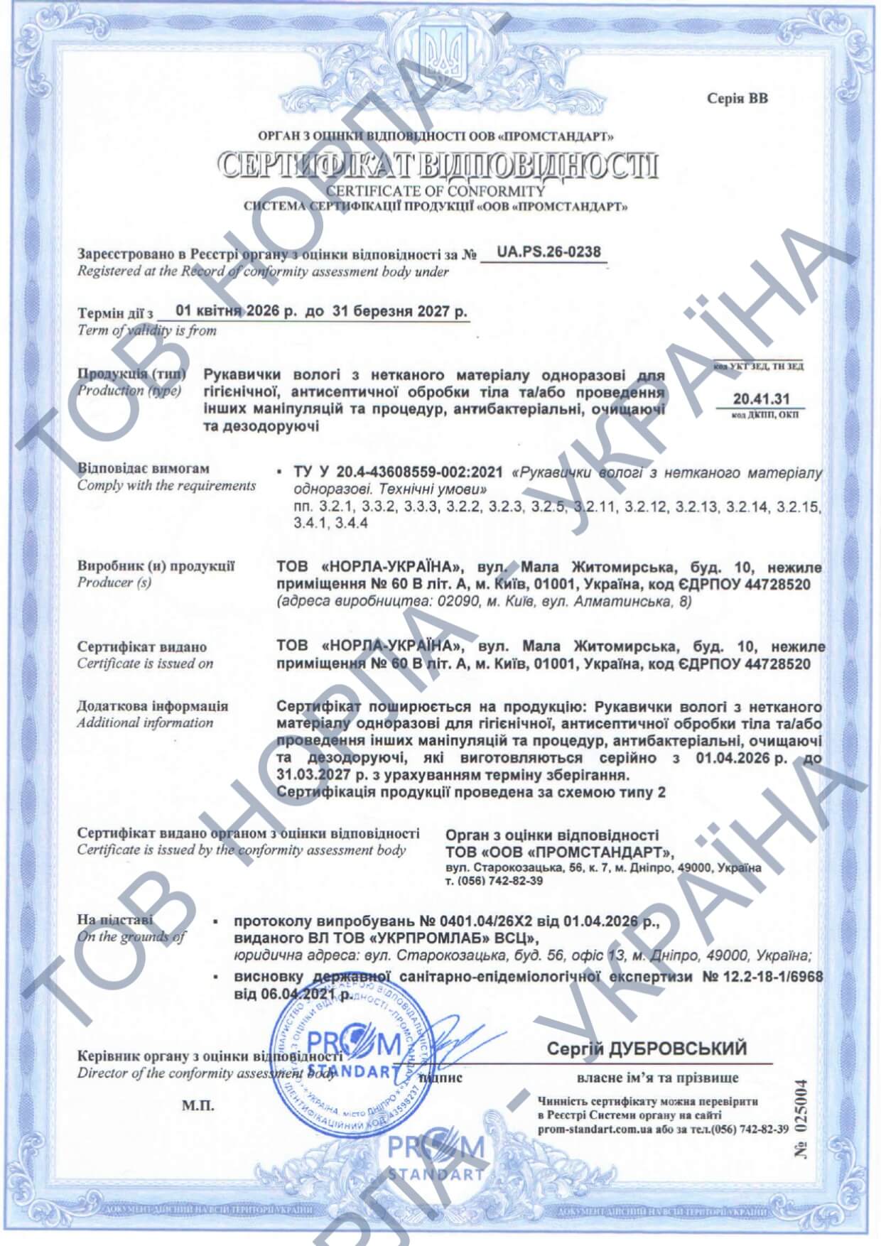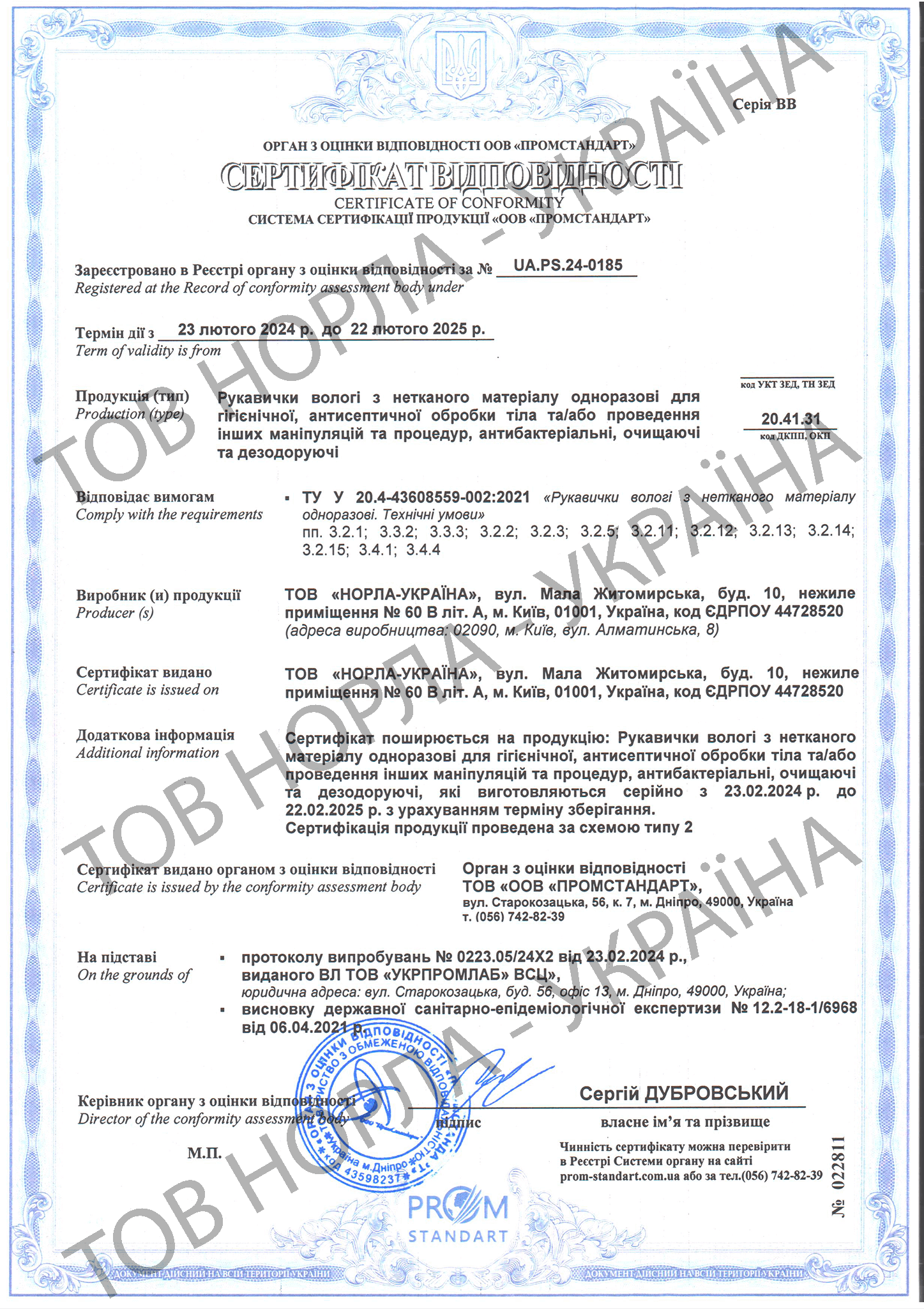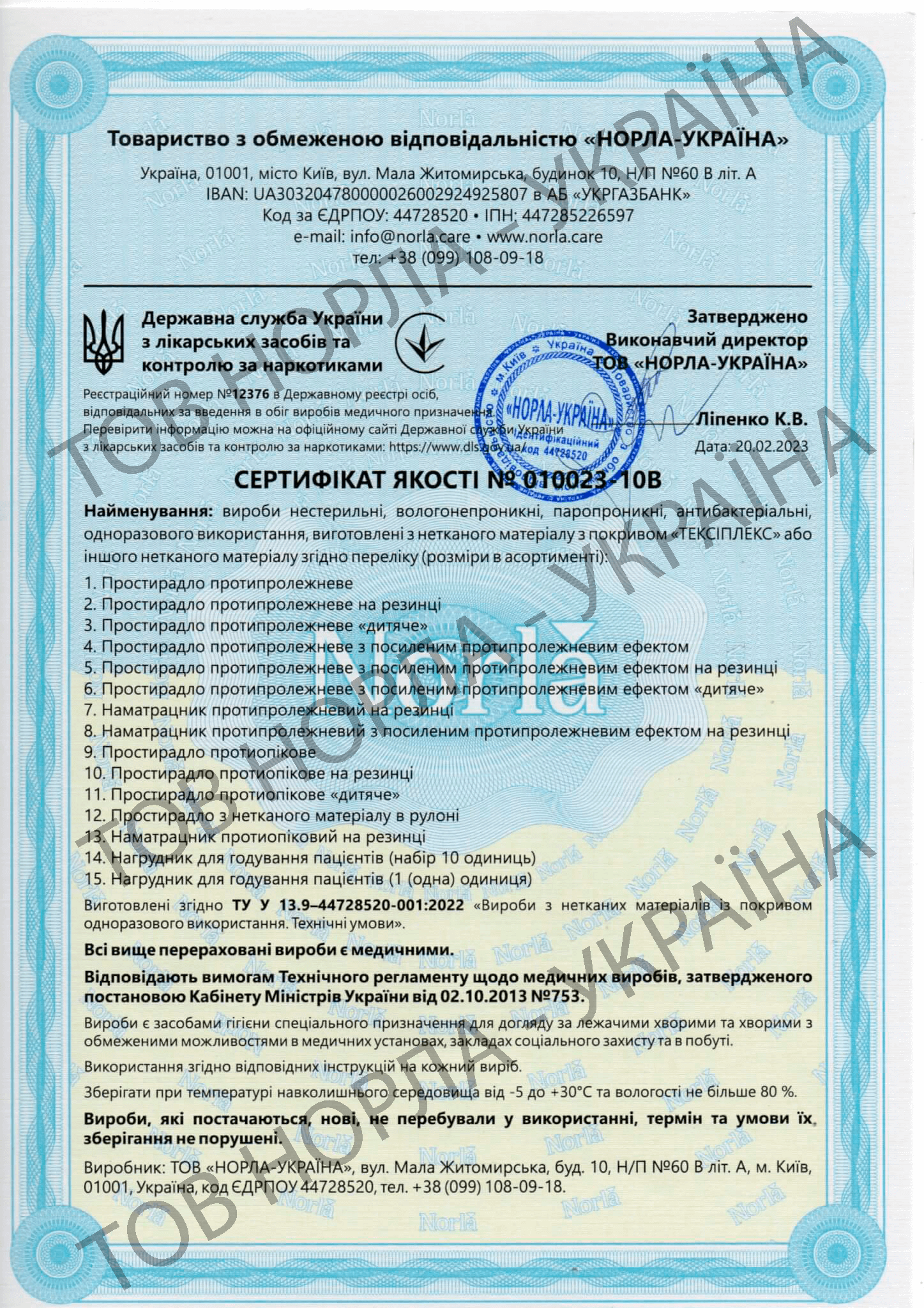Наша компанія має всі необхідні сертифікати відповідності на всю продукцію, що відпускається під маркою «НОРЛА-УКРАЇНА».