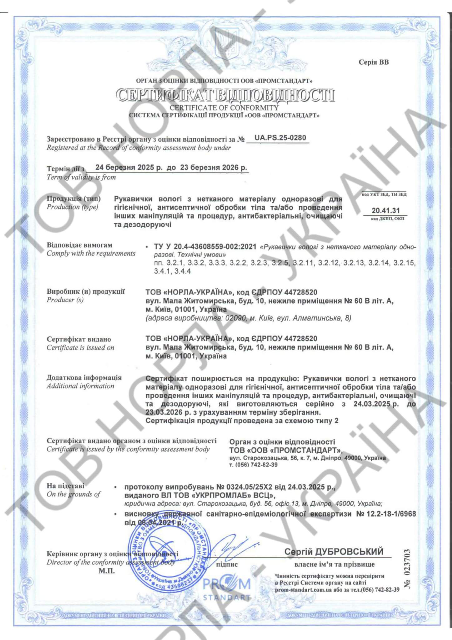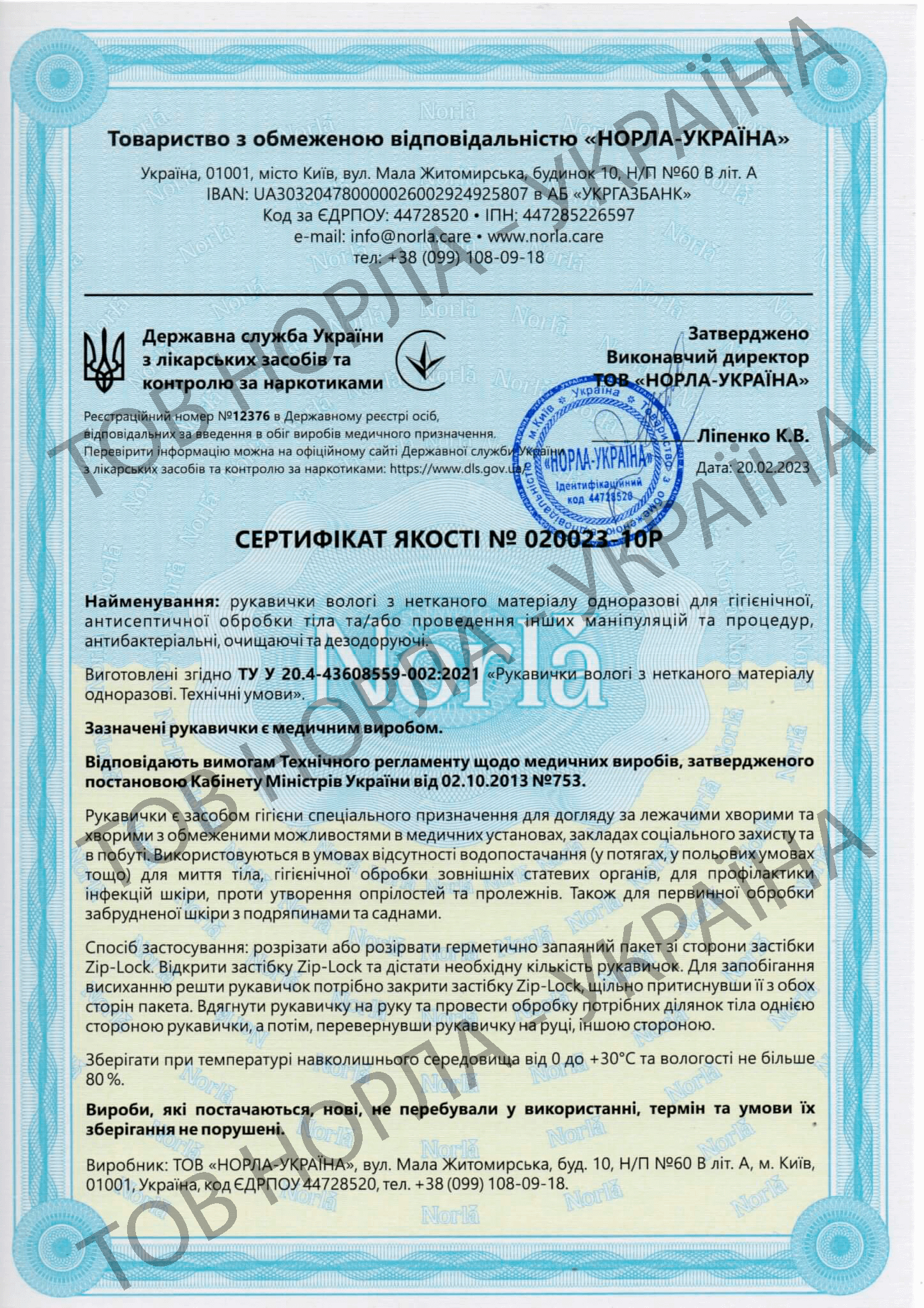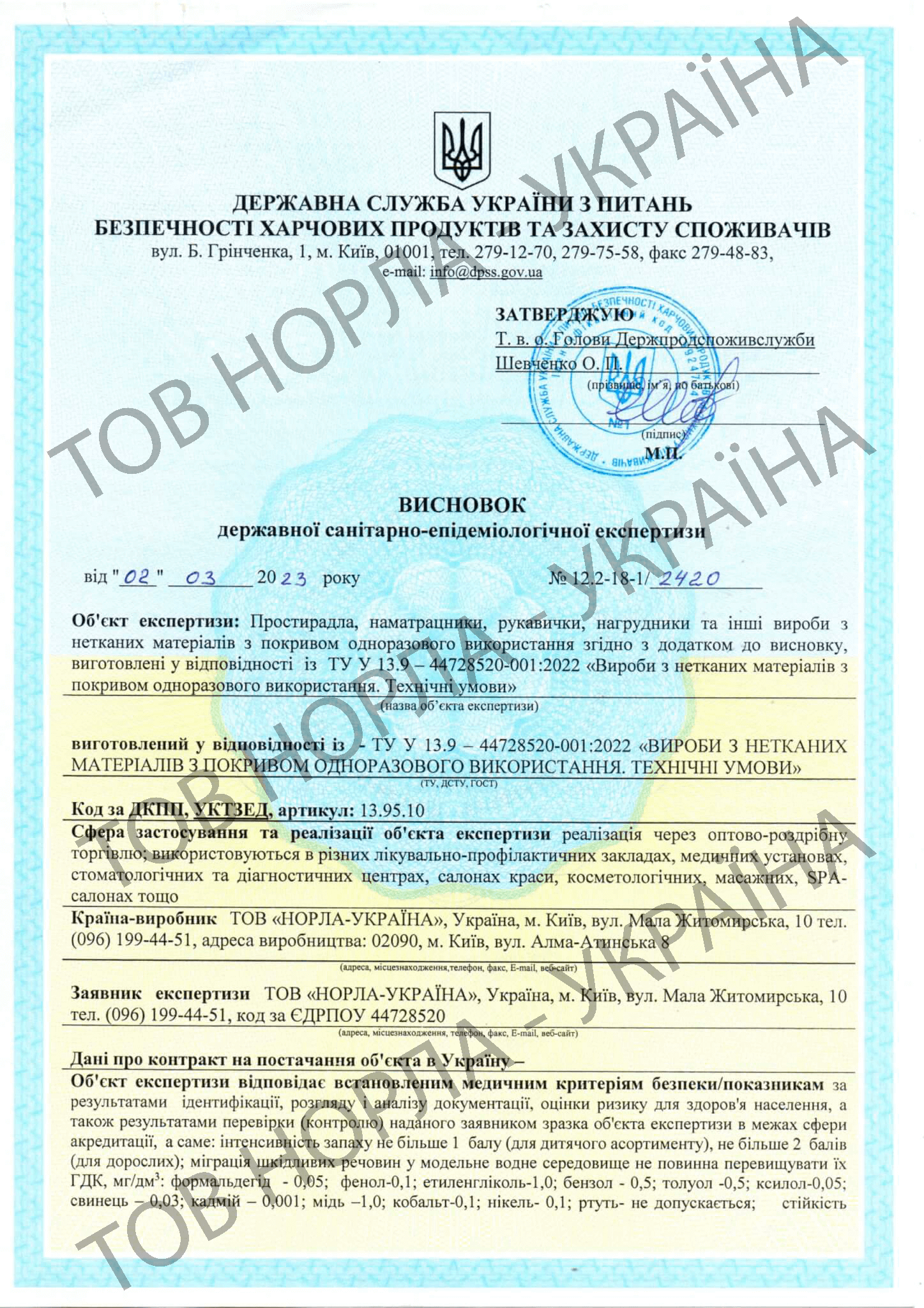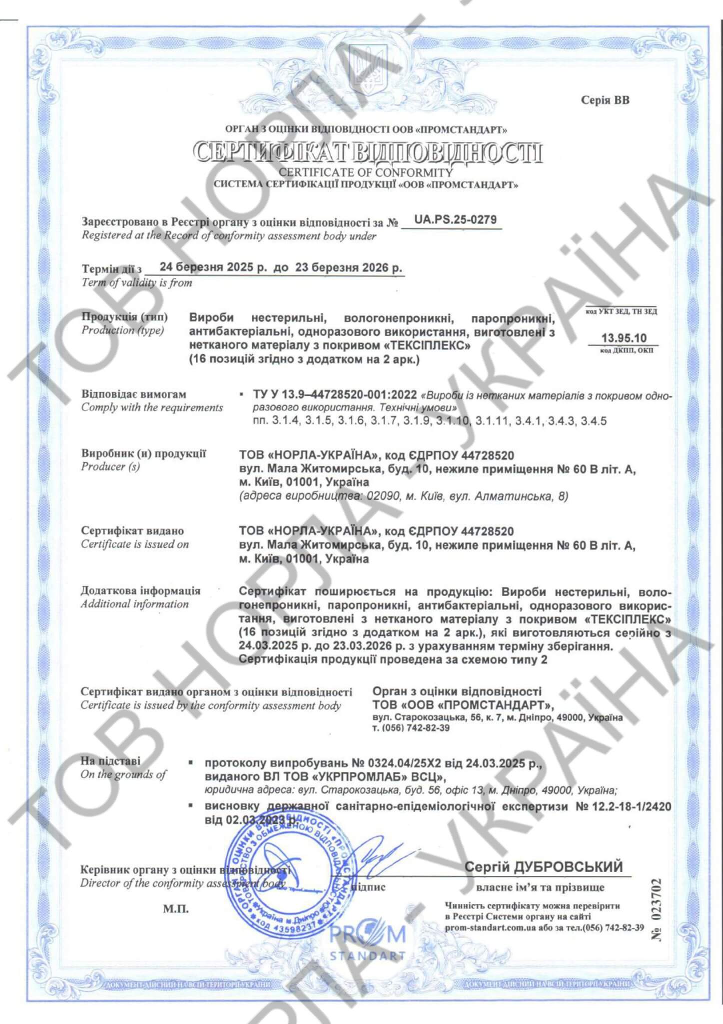 Наша компанія має всі необхідні сертифікати відповідності на всю продукцію, що відпускається під маркою «НОРЛА-УКРАЇНА».