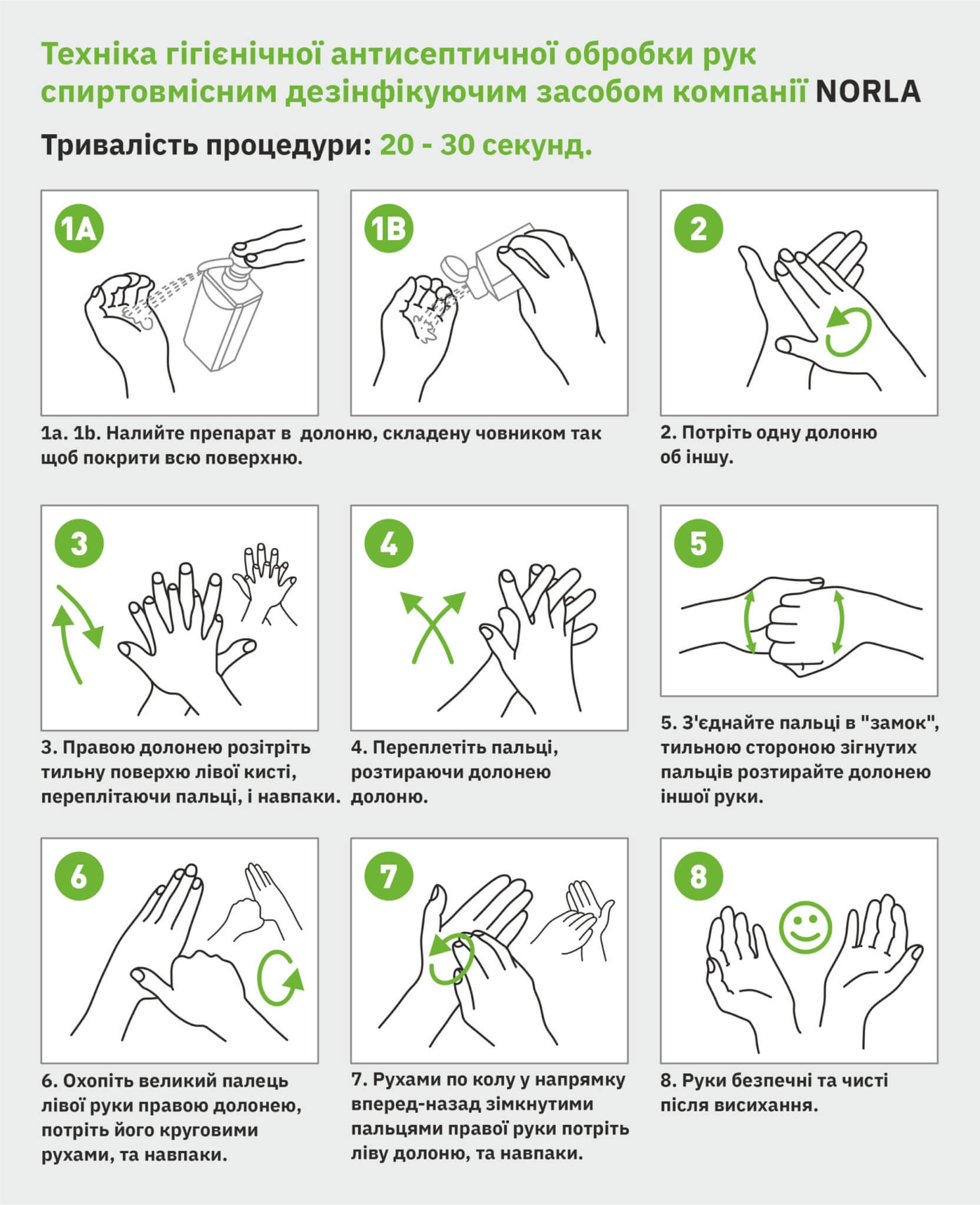 Засіб у кількості 3 мл наносять на шкіру рук шляхом втирання протягом 30 сек. (гігієнічна обробка); дезінфекцію шкіри ліктьових згинів донорів проводять 15 – 60 сек.; антисептичну обробку ін’єкційного поля проводять протягом 15 – 30 сек.; швидку дезінфекцію невеликих поверхонь медичних приладів, виробів, включаючи медичні, проводять методом протирання – експозиція 30 сек.
